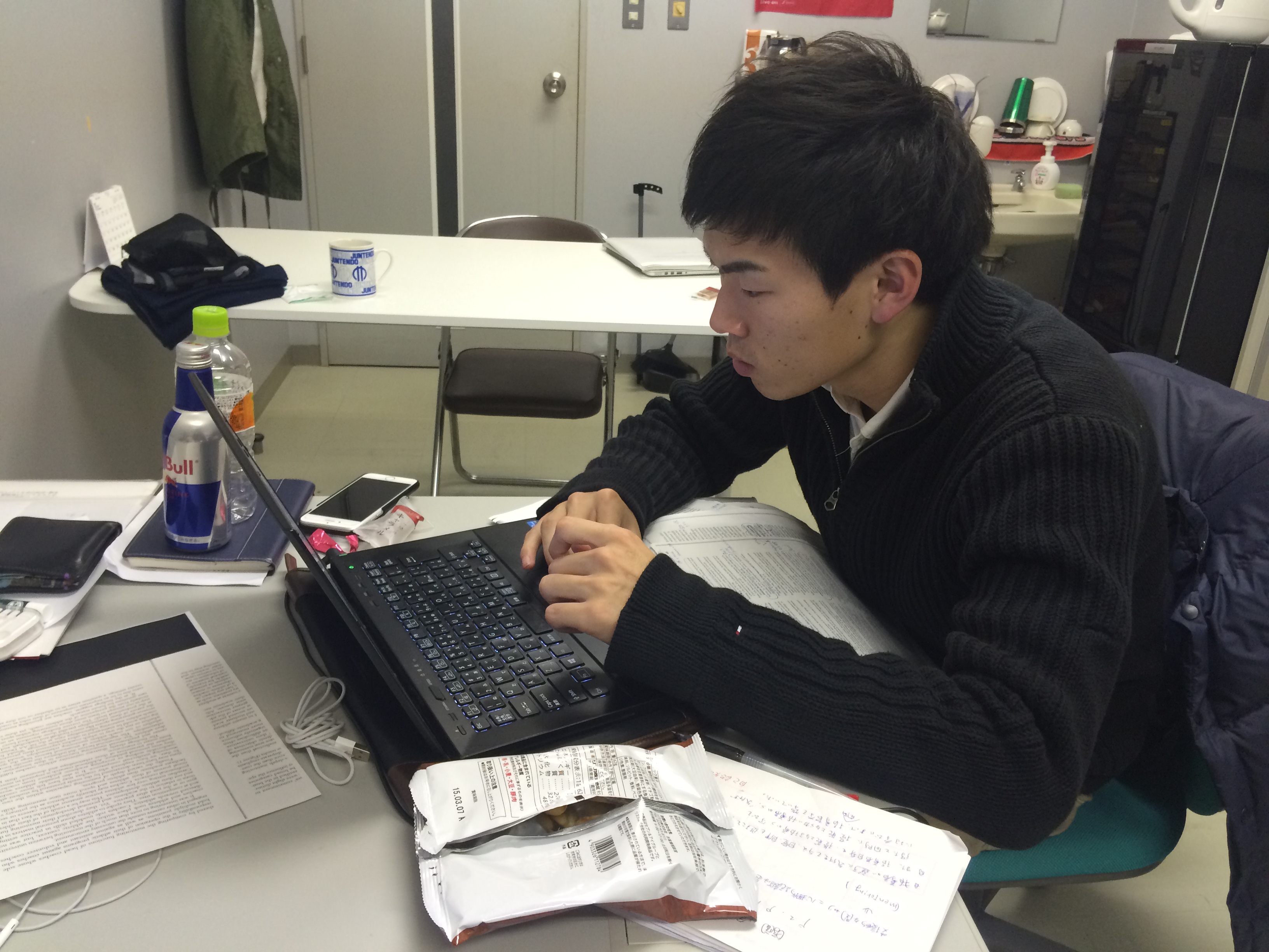 写真は必死に修士論文に取り組む順天堂大学、修士課程2年澁澤秀徳くんです。